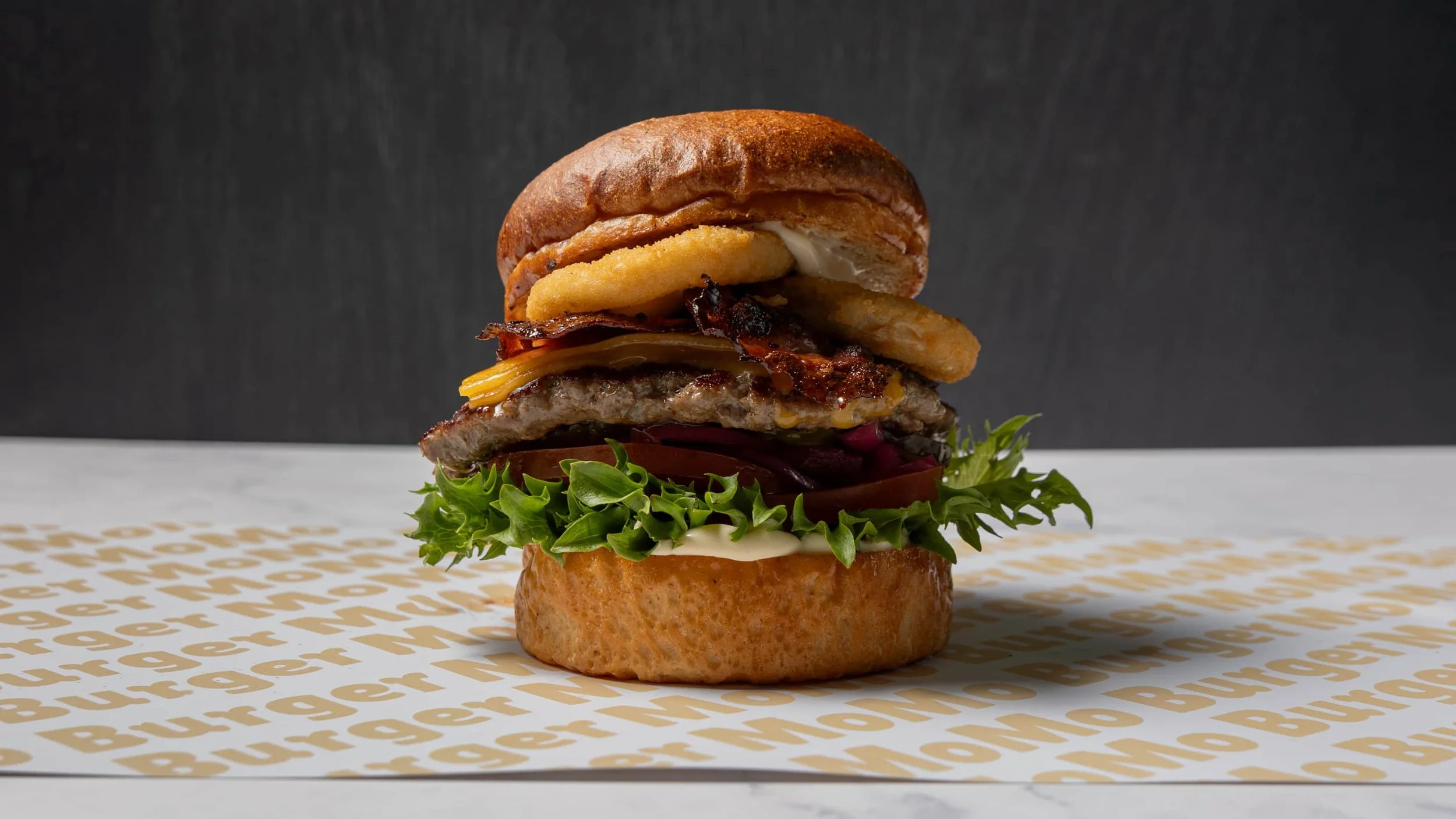 Danish beef, bacon, onion rings, pickled red onion, pickled cucumbers, crispy lettuce, tomato, melted cheddar cheese & MoMo Dijon mayo.